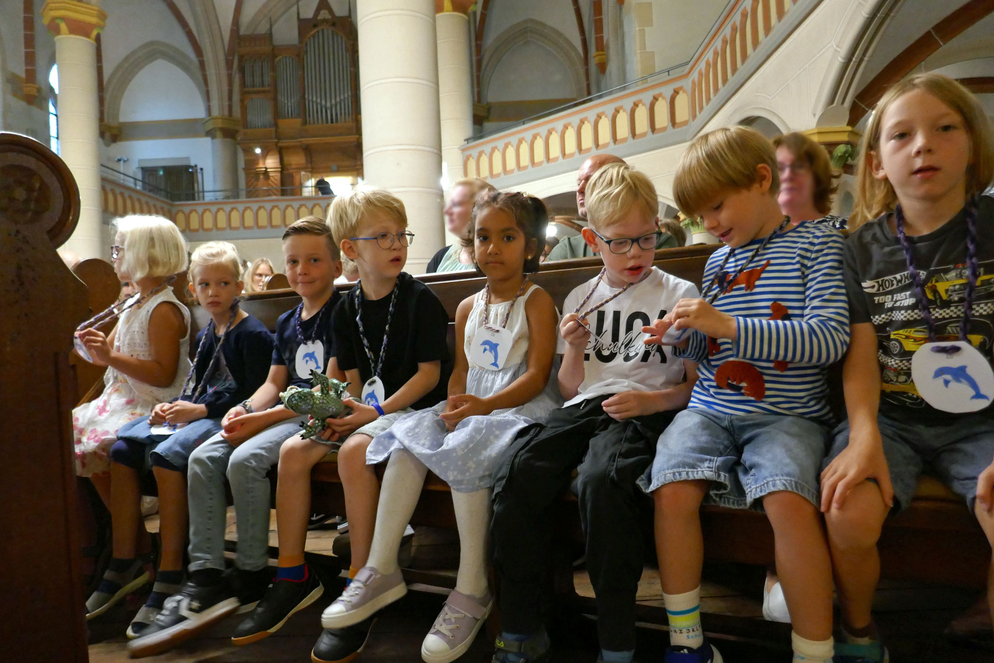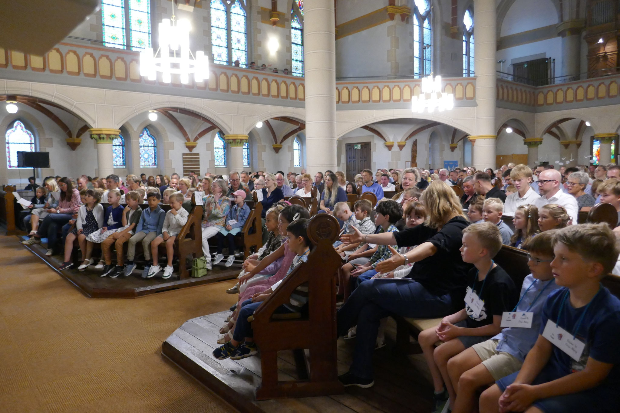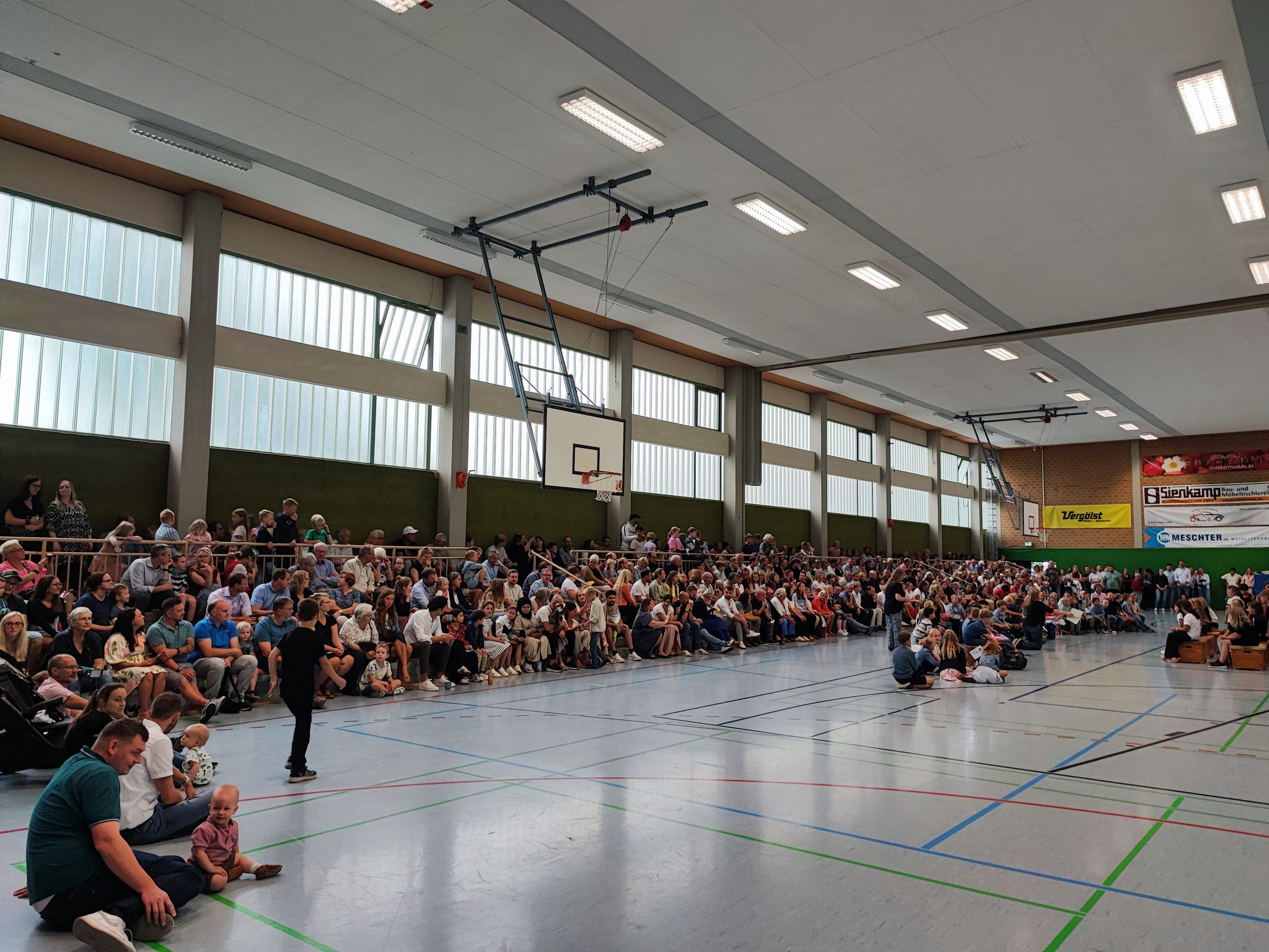 Der Tag begann mit einem feierlichen Gottesdienst in der Christophoruskirche, in dem alle Kinder gesegnet und herzlich willkommen geheißen wurden. Anschließend ging es in die große Sporthalle: Die Viertklässler sorgten mit ihrem Auftritt für gute Stimmung, und Schulleiter Herr Ostner hieß alle neuen Schulkinder sowie deren Familien willkommen.