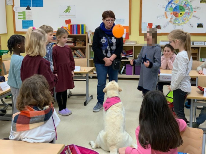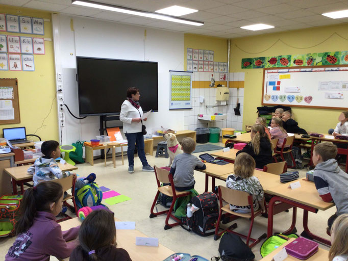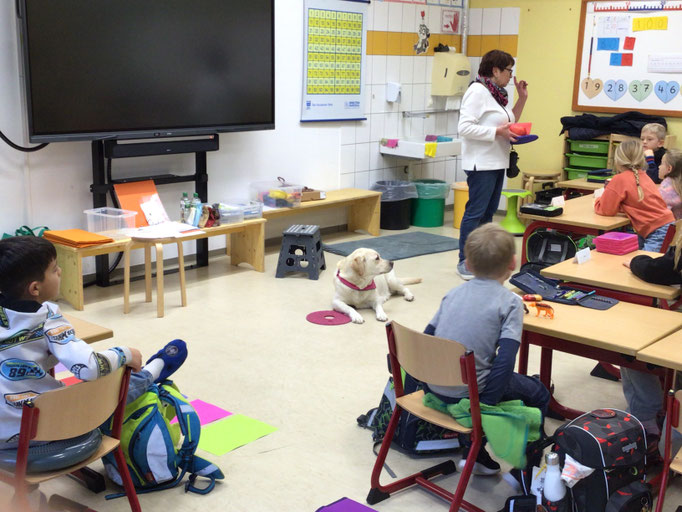 Frau Bernadette Wilken, die in der tiergestützten Pädagogik tätig ist, brachte Maja mit in die Klassen 2b und 2c, die derzeit zum Thema